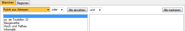 Bei dieser Auswahl werden alle 'Rubriken', welche im Adresstamm, Register [Allgemein] erfasst wurden aufgelistet.