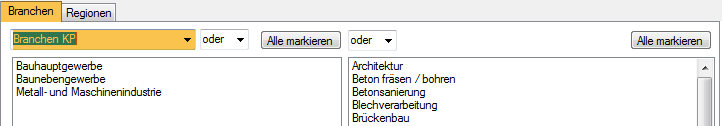 Mittels Auswahl 'und/oder', kann im Bereich 'Branche' sowie 'Erfahrungen' bestimmt werden, wie die markierten Daten miteinander in Beziehung stehen.
