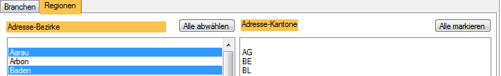 In diesem Register können Firmen gemäss dem im Adresstamm zugewiesenen 'Bezirk', oder 'Kanton', selektioniert werden.
