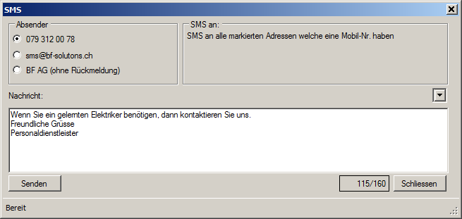- Es werden nur an Kontaktpersonen, welche eine Mobilnummer haben, SMS versendet.