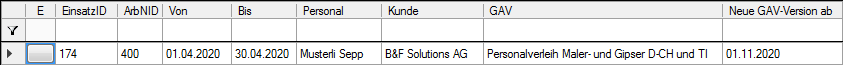 Unter dem Register [Einsätze] kann geprüft werden, in welchen Einsätzen (per festgelegtem Datum) die GAV-Abfrage nicht der letzten GAV-Version entspricht. Mittels dieser Funktion, bzw. Abfrage kann präventiv festgestellt werden, für welche Einsätze per wann ein neuer, bzw. Folgeeinsatz erstellt werden muss.