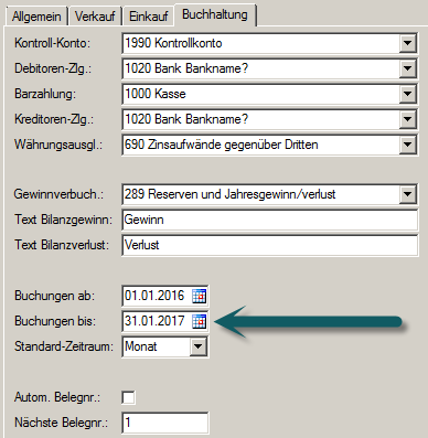 Setzen Sie dazu unter dem Menü 'Optionen', 'Firmeneinstellungen' im Register [Buchhaltung], das Datum im Feld 'Buchungen bis' auf den 31.01. des Folgejahres.