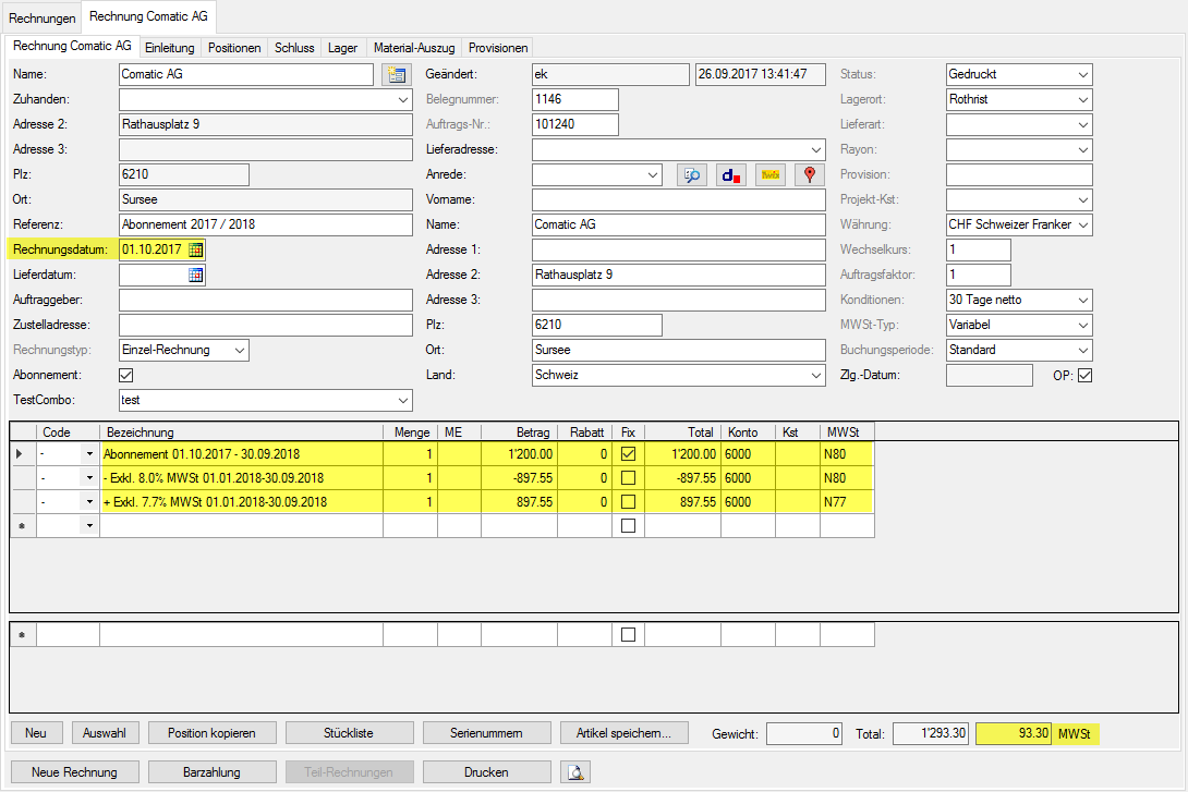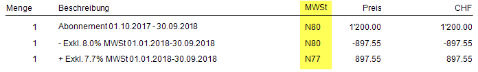 Rechnungen die vor dem 01.10.2017 verrechnet wurden und auch Leistungen für das Jahr 2018 beinhalten, müssen nicht nachträglich mit den neuen MWST-Sätzen angepasst werden. Es muss den Debitoren keine «Gutschrift» für die Differenz der MWST ausgestellt werden.