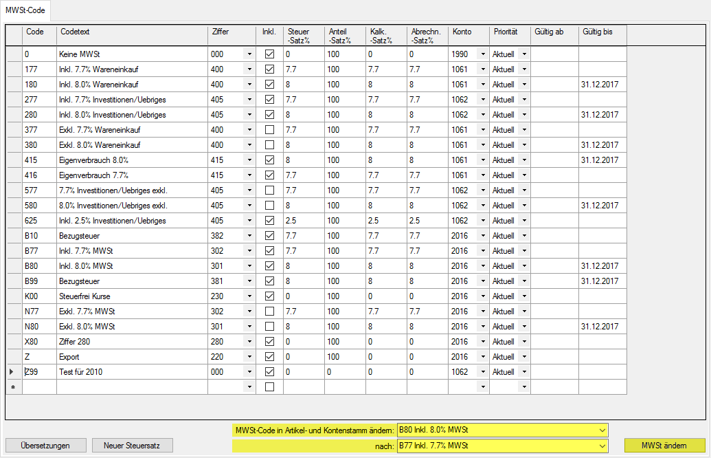 Wechseln Sie anfangs Jahr 2018, sobald Sie alle Rechnungen vom Geschäftsjahr 2017 verrechnet haben, unter Stammdaten > MWST-Code die MWST für den Artikel- und Kontenstamm. Ändern Sie die MWST aber auch bevor Sie die ersten Offerten, Aufträge, Daueraufträge und Rechnungen fürs 2018 erstellen. Nachdem Sie die MWST-Code von den Steuersätzen auf die neuen Steuersätze geändert haben, können Sie die alten MWST-Codes bei der Priorität auf «Archiv» setzen.