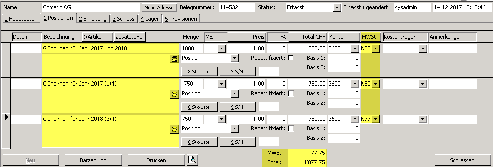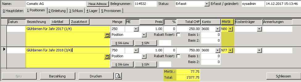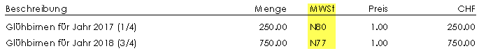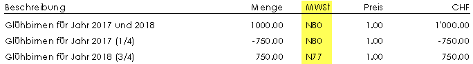 Sie verrechnen dem Kunden im Jahr 2017, 1000 Stück Glühbirnen. Ein Viertel der Glühbirnen wir im Jahr 2017 gebraucht, der Rest im 2018. Hier haben Sie zwei Möglichkeiten die Rechnung mit den jeweils gültigen Steuersätzen fürs Jahr 2017 und 2018 zu erfassen.