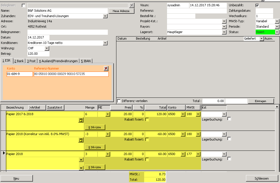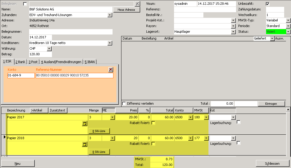 Die Hälfte vom Papier wird im Jahr 2017 gebraucht, der Rest im 2018. Hier haben Sie ebenfalls zwei Möglichkeiten die Kreditoren-Rechnung mit den jeweils gültigen Steuersätzen für das Jahr 2017 und 2018 zu erfassen.